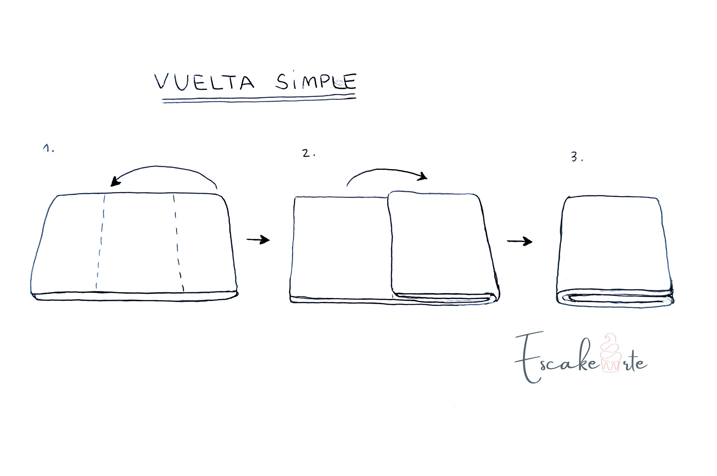 Para hacer la VUELTA SIMPLE: Dividiremos mentalmente la masa en 3 partes iguales. Plegaremos uno de los lados hacia el primer tercio, y sobre él pondremos el otro lado, tal como muestro en esta imagen: