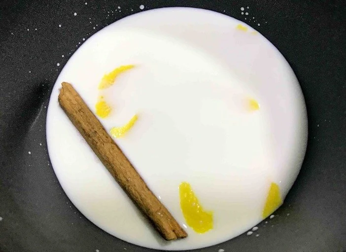 2. Prepara la infusión de leche: Calienta los 120gr de leche en un cacito pequeño (es muy poca), con la canela y la piel de limón (ten cuidado y utiliza solo la parte amarilla de la piel, ya que la parte blanca amarga) hasta que hierva. Apártalo del fuego y déjalo tapado a temperatura ambiente hasta que se enfríe un poco. Cuando haya templado mételo en la nevera y déjalo reposar toda la noche en la nevera.
