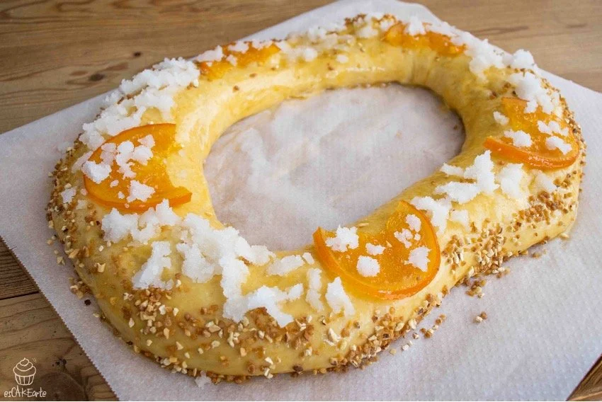Pincela muy muy bien el roscón con el huevo por todas partes, ya que al hornearlo hará que tome un color más dorado. Si te dejas alguna zona sin pincelar se verán las “ronchas” después del horneado, y quedará más feo.