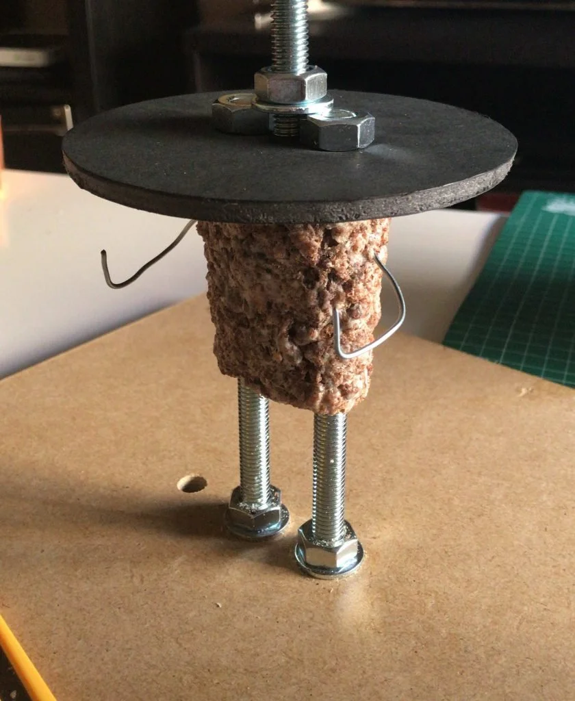 En el cartón pluma enganchamos un tercer tornillo roscado para sujetar la cabeza tal como veis en la foto.