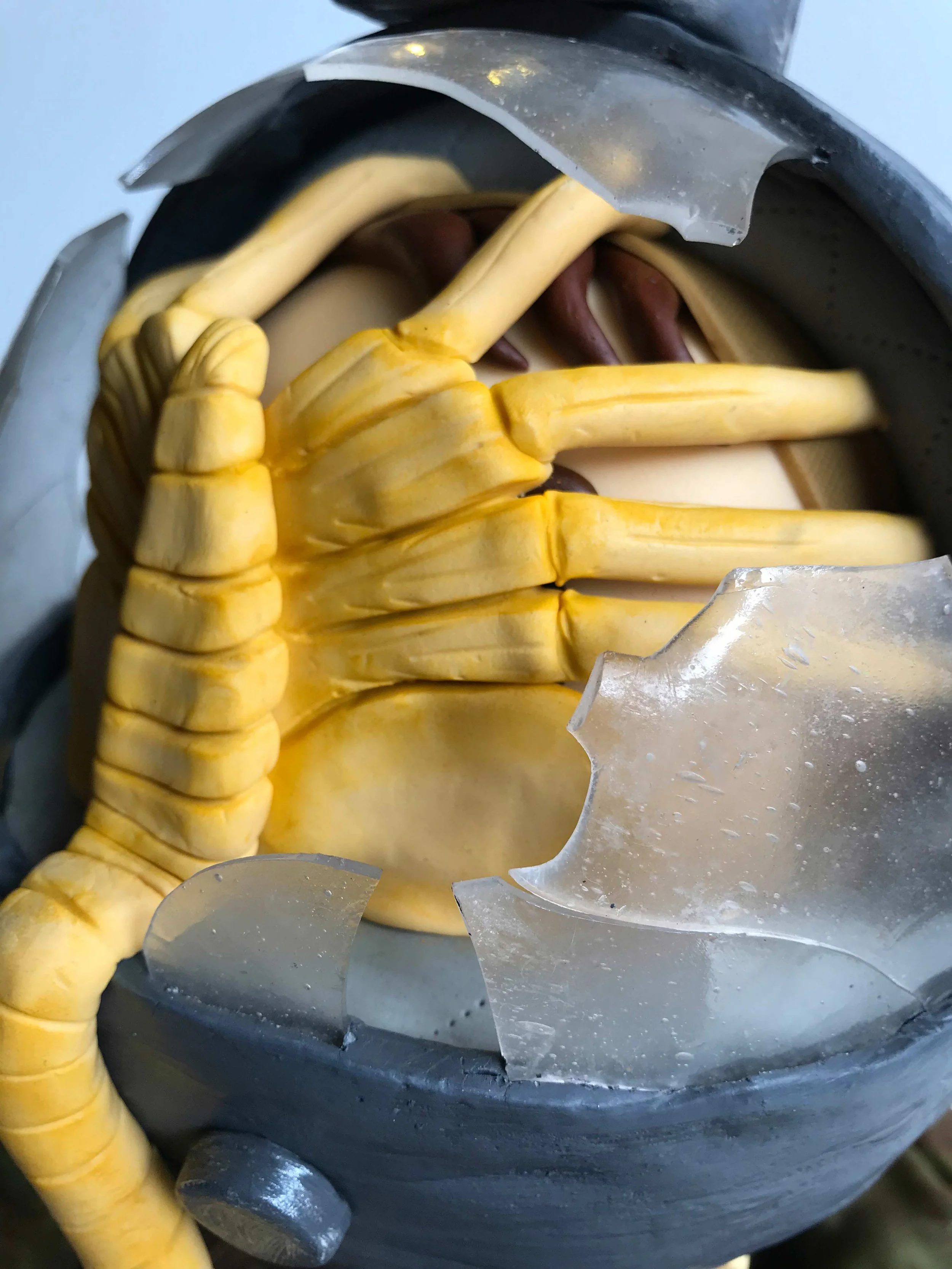 Por último ponemos el facehugger, los cristales rotos de isomalt y las luces del casco.